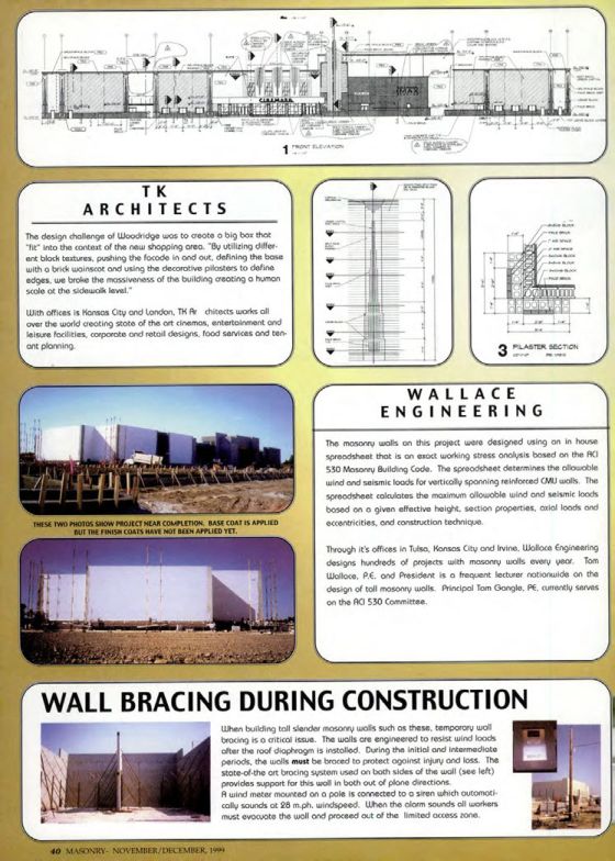 Through its offices in Tulsa, Kansas City and Irvine, Wallace Engineering designs hundreds of projects with masonry walls every year. Tom Wallace, P.E. and President is a frequent lecturer nationwide on the design of tall masonry walls. Principal Tom Gongle, PE, currently serves on the ACI 530 Committee.