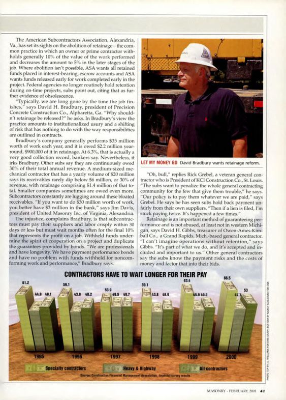"Typically, we are long gone by the time the job finishes," says David H. Bradbury, president of Precision Concrete Construction Co., Alpharetta, Ga. "Why shouldn't retainage be released?" he asks. In Bradbury's view the practice amounts to institutionalized usury and a shifting of risk that has nothing to do with the way responsibilities are outlined in contracts.