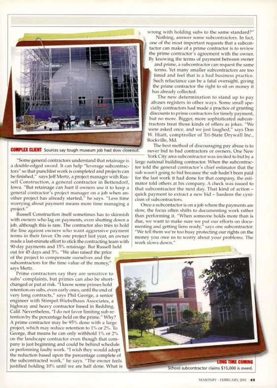 Some general contractors understand that retainage is a double-edged sword. It can help "leverage subcontractors" so that punchlist work is completed and projects can be finished," says Jeff Mertz, a project manager with Russell Construction, a general contractor in Bettendorf, lowa. "But retainage can hurt if owners use it to keep a general contractor's project manager on a job when another project has already started," he says. "Less time worrying about payment means more time managing a project."