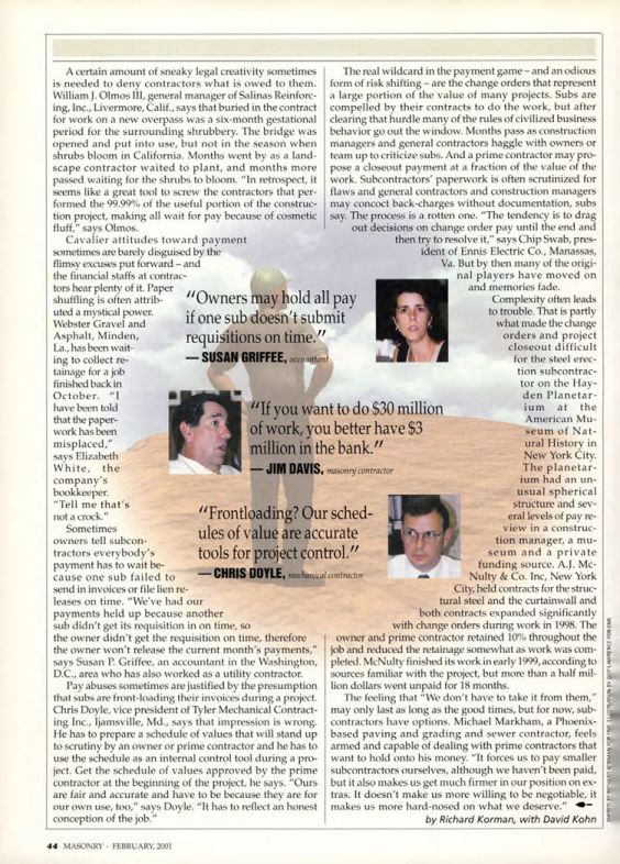 The real wildcard in the payment game - and an odious form of risk shifting - are the change orders that represent a large portion of the value of many projects. Subs are compelled by their contracts to do the work, but after clearing that hurdle many of the rules of civilized business behavior go out the window. Months pass as construction managers and general contractors haggle with owners or team up to criticize subs. And a prime contractor may propose a closeout payment at a fraction of the value of the work. Subcontractors' paperwork is often scrutinized for flaws and general contractors and construction managers may concoct back-charges without documentation, subs say. The process is a rotten one. "The tendency is to drag out decisions on change order pay until the end and then try to resolve it," says Chip Swab, president of Ennis Electric Co., Manassas, Va. But by then many of the original players have moved on and memories fade.