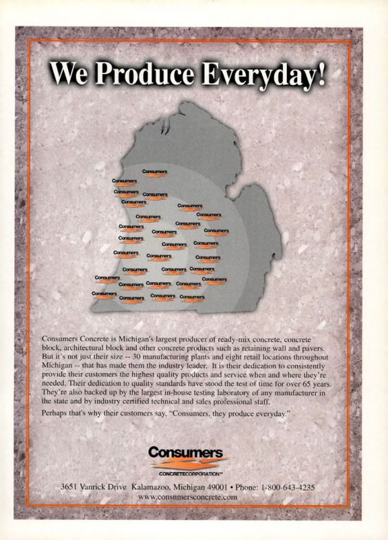 Consumers Concrete is Michigan's largest producer of ready-mix concrete, concrete block, architectural block and other concrete products such as retaining wall and pavers. But it's not just their size -- 30 manufacturing plants and eight retail locations throughout Michigan -- that has made them the industry leader. It is their dedication to consistently provide their customers the highest quality products and service when and where they're needed. Their dedication to quality standards have stood the test of time for over 65 years. They're also backed up by the largest in-house testing laboratory of any manufacturer in the state and by industry certified technical and sales professional staff.