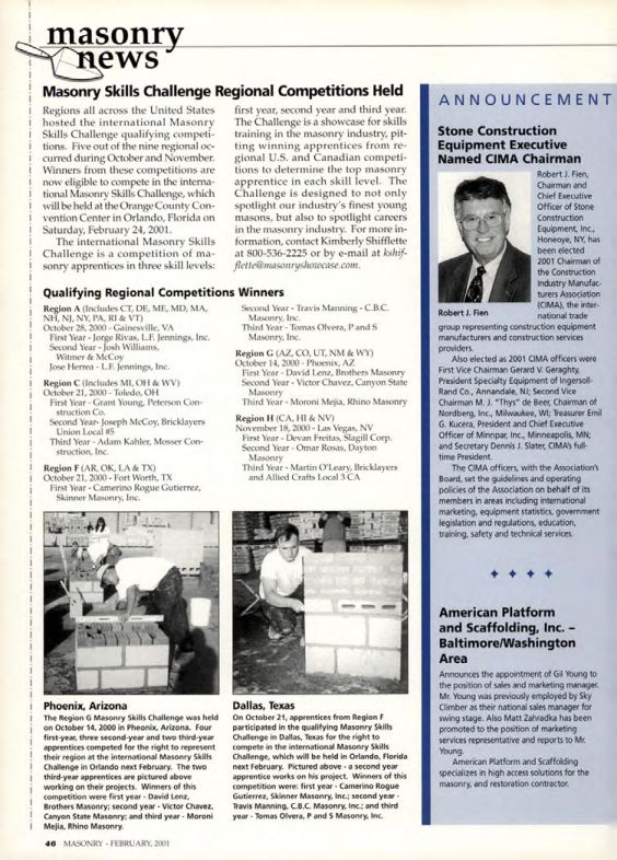 Regions all across the United States hosted the international Masonry Skills Challenge qualifying competitions. Five out of the nine regional occurred during October and November. Winners from these competitions are now eligible to compete in the international Masonry Skills Challenge, which will be held at the Orange County Convention Center in Orlando, Florida on Saturday, February 24, 2001.