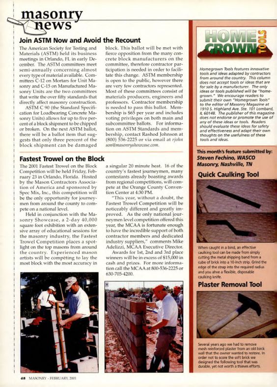 The 2001 Fastest Trowel on the Block Competition will be held Friday, February 23 in Orlando, Florida. Hosted by the Mason Contractors Association of America and sponsored by Spec Mix, Inc., this competition will be the only opportunity for journeymen from around the county to compete on a national level.