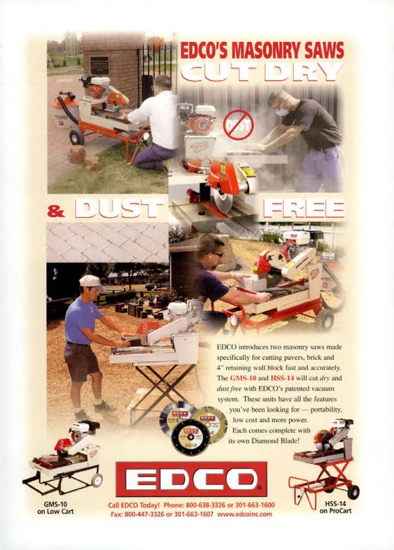 EDCO introduces two masonry saws made specifically for cutting pavers, brick and 4" retaining wall block fast and accurately. The GMS-10 and HSS-14 will cut dry and dust free with EDCO's patented vacuum system. These units have all the features you've been looking for portability, low cost and more power. Each comes complete with its own Diamond Blade!