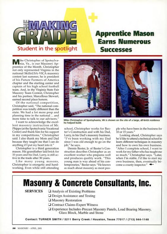 Mike Christopher of Spotsylvania, Virginia, is our Masonry Apprentice of the Month. Christopher not only represented Virginia in the national SkillsUSA-VICA masonry contest last summer, he is president of his Future Farmers of America chapter and the starting center and captain of his high school football team. And, in the Virginia State Fair Masonry Team Contest, Christopher and his partner, Marcellous Stewart, earned second place honors.