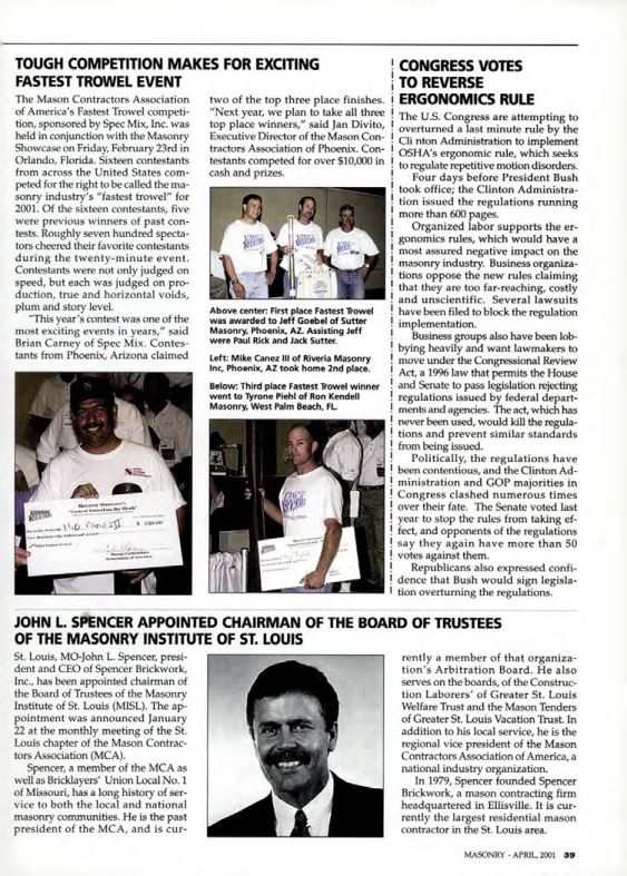 Spencer, a member of the MCA as well as Bricklayers' Union Local No. 1 of Missouri, has a long history of service to both the local and national masonry communities. He is the past president of the MCA, and is currently a member of that organization's Arbitration Board. He also serves on the boards, of the Construction Laborers' of Greater St. Louis Welfare Trust and the Mason Tenders of Greater St. Louis Vacation Trust. In addition to his local service, he is the regional vice president of the Mason Contractors Association of America, a national industry organization.