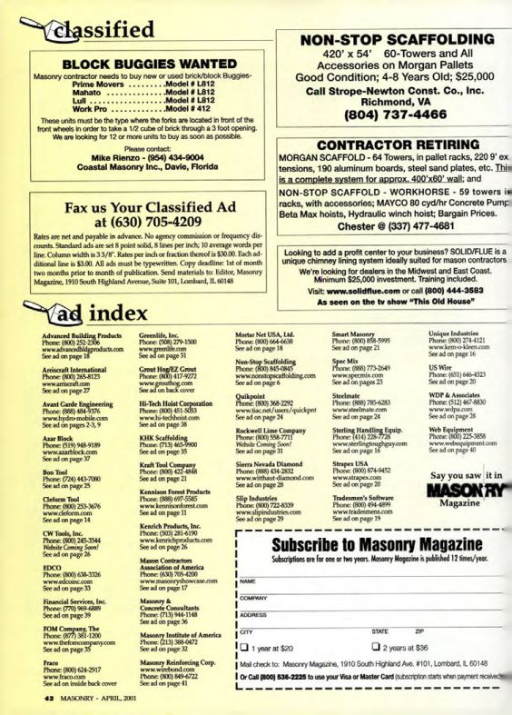 Fax us Your Classified Ad at (630) 705-4209. Rates are net and payable in advance. No agency commission or frequency discounts. Standard ads are set 8 point solid, 8 lines per inch; 10 average words per line. Column width is 33/8". Rates per inch or fraction thereof is $30.00. Each additional line is $3.00. All ads must be typewritten. Copy deadline: 1st of month two months prior to month of publication. Send materials to: Editor, Masonry Magazine, 1910 South Highland Avenue, Suite 101, Lombard, IL 60148