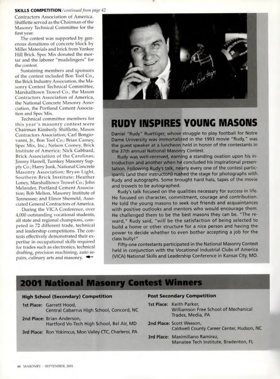 Daniel "Rudy" Ruettiger, whose struggle to play football for Notre Dame University was immortalized in the 1993 movie "Rudy," was the guest speaker at a luncheon held in honor of the contestants in the 37th annual National Masonry Contest.