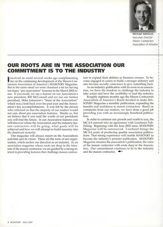 I received an email several weeks ago complimenting me on the continuing development of the Mason Contractors Association of America's MASONRY Magazine. But in the same email we were chastised a bit for having too many "pro-association" features in the March 2002 issue. If you recall, we ran a feature on our Association's new president, Bill McConnell and we ran our former president, Mike Johnston's "State of the Association" which was a look back over the past year and the Association's key accomplishments. It was felt by the person who criticized us that the majority of our readers would not care about pro-association features. Maybe so, but we believe that if you read the words of our presidents you will find the future. In our Association features you will discover where the Association and the industry mason contractors will be going, what goals will be achieved and how we will attempt to build masonry into the dominant material.