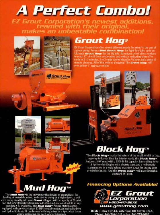 EZ Grout Corporation offers several different models for about 1/3 the cost of a grout pump. From a Mini Grout Hage for light duty jobs, up to an Ultimate Grout Hoge for the big jobs. Its unique swivel allows workers to reach 17' of wall from one location and with an unloading time of 3/4 yards in 2 1/2 minutes, 2 to 3 yards can be placed in 1/2 hour and a quick 15 minute clean up. All of this with no plugging! The Grout Hoge will even deliver 1 aggregate mixes.