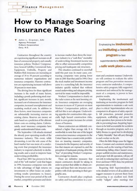 Contractors throughout the country are experiencing significant increases on all lines of commercial property and casualty insurance policies. Workers' Compensation, General Liability, Commercial Auto, Equipment, Umbrella, Property and Builders Risk insurance are increasing an average of 30 to 50 percent according to numerous industry organizations and insurance companies. Masonry contractors are experiencing increases well above 30 percent in most states.