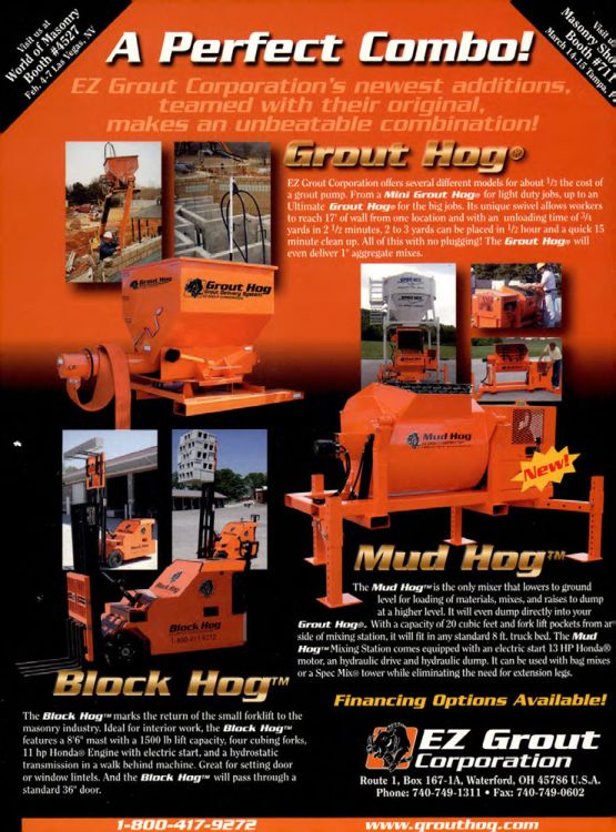 EZ Grout Corporation offers several different models for about 1/3 the cost of a grout pump. From a Mini Grout Hage for light duty jobs, up to an Ultimate Grout Hoge for the big jobs. Its unique swivel allows workers to reach 17' of wall from one location and with an unloading time of 3/4 yards in 2 1/2 minutes, 2 to 3 yards can be placed in 1/2 hour and a quick 15 minute clean up. All of this with no plugging! The Grout Hoge will even deliver 1 aggregate mixes.