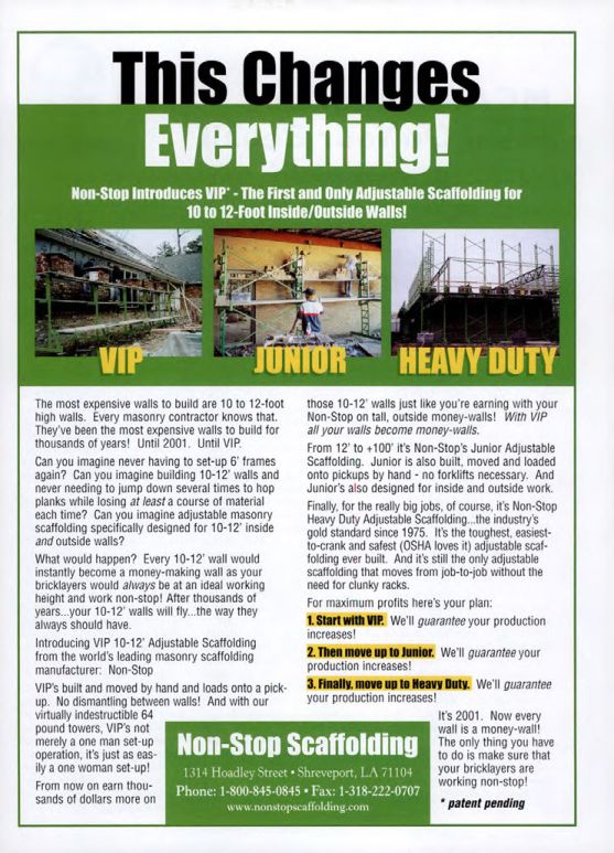 From 12' to +100' it's Non-Stop's Junior Adjustable Scaffolding. Junior is also built, moved and loaded onto pickups by hand no forklifts necessary. And Junior's also designed for inside and outside work.