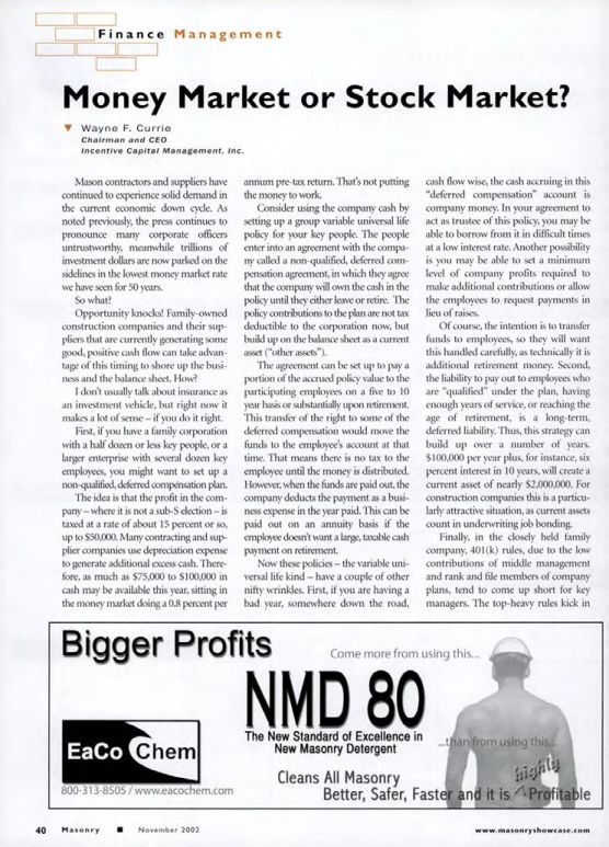 Mason contractors and suppliers have continued to experience solid demand in the current economic down cycle. As noted previously, the press continues to pronounce many corporate officers untrustworthy, meanwhile trillions of investment dollars are now parked on the sidelines in the lowest money market rate we have seen for 50 years.