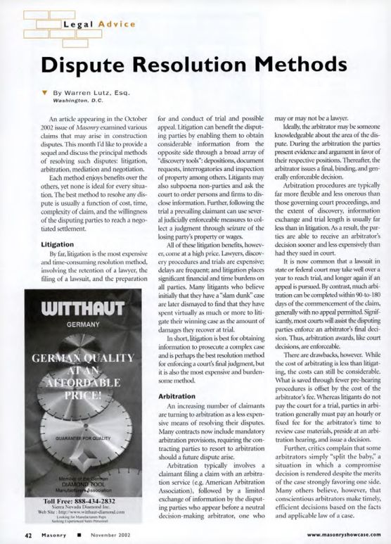 An article appearing in the October 2002 issue of Masonry examined various claims that may arise in construction disputes. This month I'd like to provide a sequel and discuss the principal methods of resolving such disputes: litigation, arbitration, mediation and negotiation.