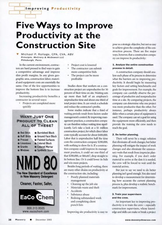 A construction company should analyze each phase of its process to determine what the barriers are to improving productivity. It should begin by measuring key factors and setting benchmarks and goals for improvement. For example, the company can carefully observe the percentage of productive and nonproductive time at a site. By comparing projects, the company can determine why one project was more productive than the other. For instance, perhaps productivity always slides when a certain piece of equipment is used. The company can set a goal for using the equipment more efficiently, and then provide the training the crew needs to reach the goal.