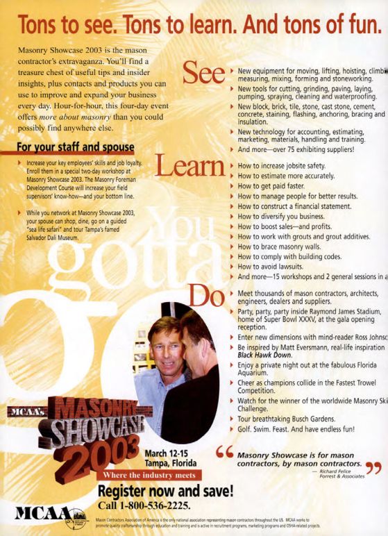 Masonry Showcase 2003 is the mason contractor's extravaganza. You'll find a treasure chest of useful tips and insider insights, plus contacts and products you can use to improve and expand your business every day. Hour-for-hour, this four-day event offers more about masonry than you could possibly find anywhere else.