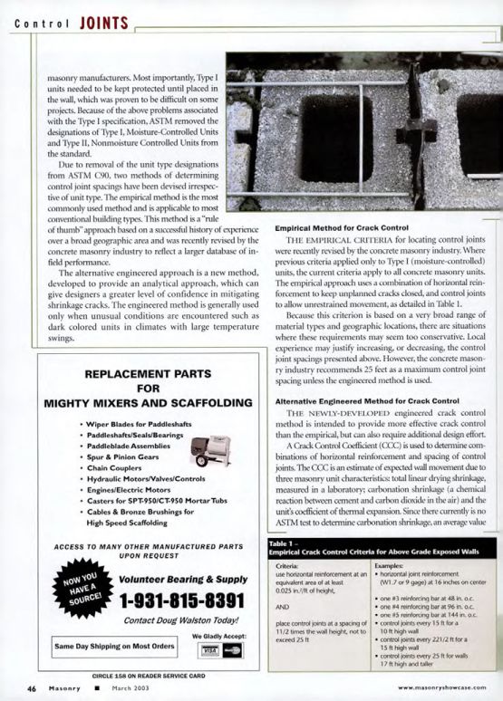 THE EMPIRICAL CRITERIA for locating control joints were recently revised by the concrete masonry industry. Where previous criteria applied only to Type I (moisture-controlled) units, the current criteria apply to all concrete masonry units. The empirical approach uses a combination of horizontal reinforcement to keep unplanned cracks closed, and control joints to allow unrestrained movement, as detailed in Table 1.