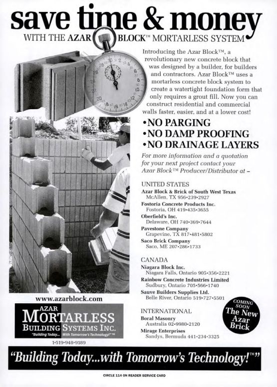 Introducing the Azar Block™™, a revolutionary new concrete block that was designed by a builder, for builders and contractors. Azar Block™™ uses a mortarless concrete block system to create a watertight foundation form that only requires a grout fill. Now you can construct residential and commercial walls faster, easier, and at a lower cost!
