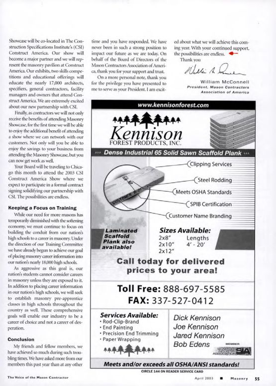 My friends and fellow members, we have achieved so much during such troubling times. We have asked more from our members this past year than at any other time and you have responded. We have never been in such a strong position to impact our future as we are today. On behalf of the Board of Directors of the Mason Contractors Association of America, thank you for your support and trust.