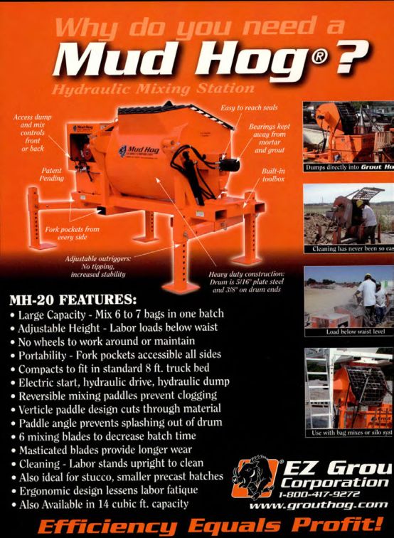 Access dump and mix controls front or back. Easy to reach seals. Bearings kept away from mortar and grout. Patent Pending. Built-in toolbox. Dumps directly into Grout Ho.