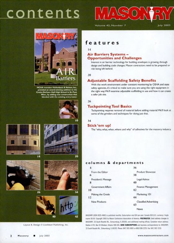 MASONRY (ISSN 0025-4681) is publishedmety Subscription rate $24 per year: Canada $30 (US. cumency) Single copies $3.50. Copyright 2003 by Mason Contractors Association of America, POSTMASTER: Send address changes to MASONRY, 33 South Roselle Rd. Schaumburg, IL 60193, and additional malling offices. Canadian return address Station A P.D. Box 54 Windsor, Ontario NDA 615. SEND SUBSCRIPTIONS and business comespondence to MASONRY 33 South Roselle Rd., Schaumburg, IL 60193. Phone: 847/301-0000 or 800/536-2225. Fax: 847/301-1110.