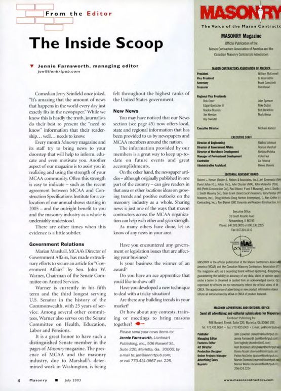 MASONRY is the official publication of the Mason Contractors Association of America (MCAA) and the Canadian Masonry Contractors Association (CMCA). The magazine acts as a sounding board without approving, disapproving or guaranteeing the validity or accuracy of any data, claim or opinion appearing under a byline or obtained or quoted from an acknowledged source. Opinions expressed by officers do not necessarily reflect the official views of MCAA or CMCA. The appearance of advertising or new product information doesn't constitute an endorsement by MCAA or CMCA of product featured.
