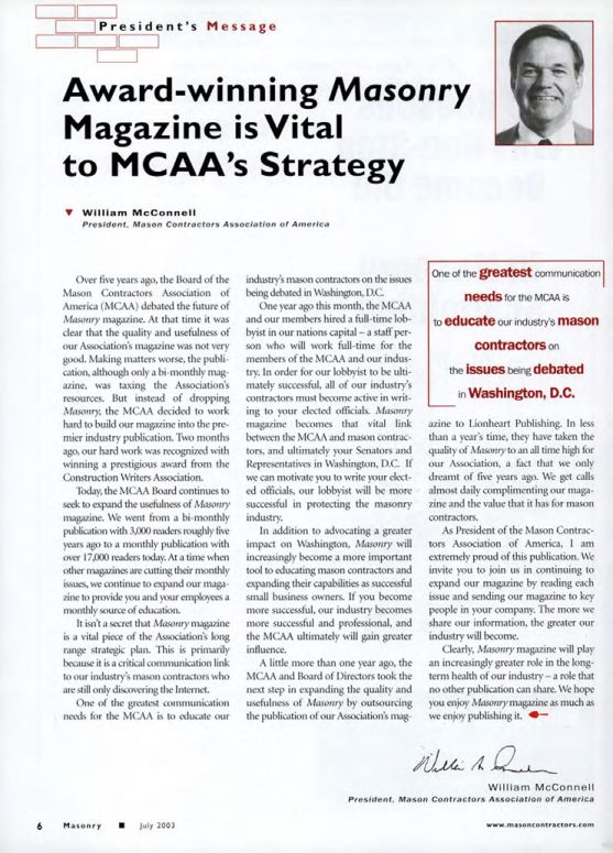 A little more than one year ago, the MCAA and Board of Directors took the next step in expanding the quality and usefulness of Masonry by outsourcing the publication of our Association's magazine to Lionheart Publishing. In less than a year's time, they have taken the quality of Masonry to an all time high for our Association, a fact that we only dreamt of five years ago. We get calls almost daily complimenting our magazine and the value that it has for mason contractors.