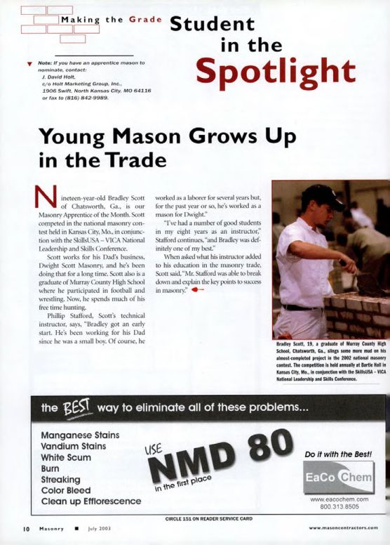 Nineteen-year-old Bradley Scott of Chatsworth, Ga., is our Masonry Apprentice of the Month. Scott competed in the national masonry contest held in Kansas City, Mo., in conjunction with the SkillsUSA-VICA National Leadership and Skills Conference.