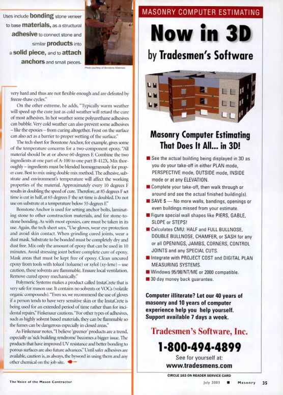 Bonstone Anchor is used for setting anchor bolts, laminating stone to other construction materials, and for stone-to-stone bonding. As with most epoxies, care must be taken in its use. Again, the tech sheet says, "Use gloves, wear eye protection and avoid skin contact. When grinding cured joints, wear a dust mask. Substrate to be bonded must be completely dry and dust free. Mix only the amount of epoxy that can be used in 10 minutes. Avoid stressing joint before complete cure of epoxy, Mask areas that must be kept free of epoxy. Clean uncured epoxy from tools with toluol (toluene) or xylol (xy-lene) - use caution, these solvents are flammable. Ensure local ventilation. Remove cured epoxy mechanically."