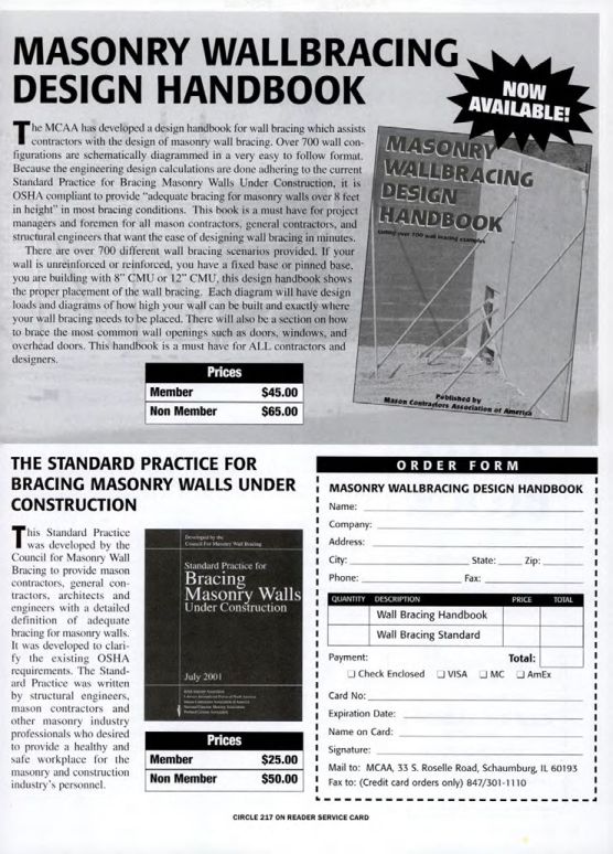 The MCAA has developed a design handbook for wall bracing which assists contractors with the design of masonry wall bracing. Over 700 wall configurations are schematically diagrammed in a very easy to follow format. Because the engineering design calculations are done adhering to the current Standard Practice for Bracing Masonry Walls Under Construction, it is OSHA compliant to provide "adequate bracing for masonry walls over 8 feet in height" in most bracing conditions. This book is a must have for project managers and foremen for all mason contractors, general contractors, and structural engineers that want the ease of designing wall bracing in minutes.