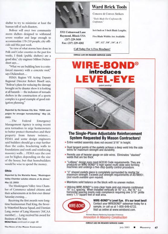 Reported by the Kansas City Star, "FEMA campaigns for stronger homebuilding." May 15. 2003: The Federal Emergency Management Agency is using recent area tornadoes to urge homeowners to better protect themselves and their property from future twisters. FEMA and some design engineers said builders should go a step further than the codes, bracketing walls to foundations and roofs and reinforcing masonry walls. FEMA says the cost can be higher, depending on the size of the house, but that homebuilders would be wise to spend the money.