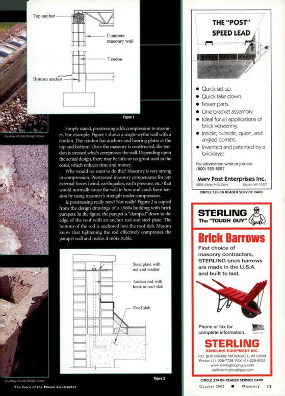 Is prestressing really new? Not really! Figure 2 is copied from the design drawings of a 1960s building with brick parapets. In the figure, the parapet is "clamped" down to the edge of the roof with an anchor rod and steel plate. The bottom of the rod is anchored into the roof slab. Masons know that tightening the rod effectively compresses the parapet wall and makes it more stable.