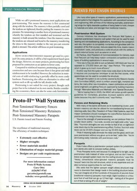 With many of the same attributes as its loadbearing cousin, post-tension masonry can also be utilized for non-loadbearing fences and retaining walls. Gary Otto, President of Proto II Wall Systems, says that mason contractors should investigate the cost-effective features that post-tension can bring to these applications.