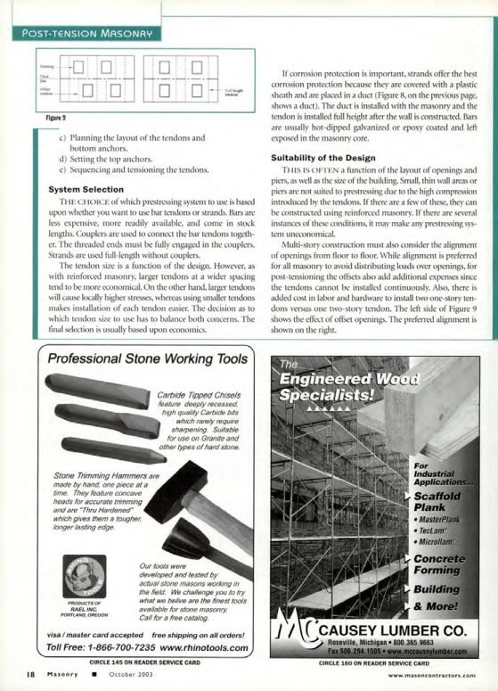 THIS IS OFTEN a function of the layout of openings and piers, as well as the size of the building. Small, thin wall areas or piers are not suited to prestressing due to the high compression introduced by the tendons. If there are a few of these, they can be constructed using reinforced masonry. If there are several instances of these conditions, it may make any prestressing system uneconomical.