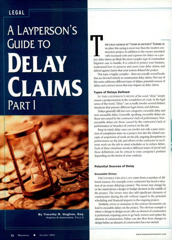 THE OLD ADAGE IS "TIME IS MONEY." THERE IS no place this saying is more true than the modern construction project. In addition to the money associated with increased costs and expenses for delays on a project, delay claims are likely the most complex type of construction litigation case to handle. It is critical to protect your business, understand how to preserve and assert your delay claims, and defend against claims that your actions delayed the project.
