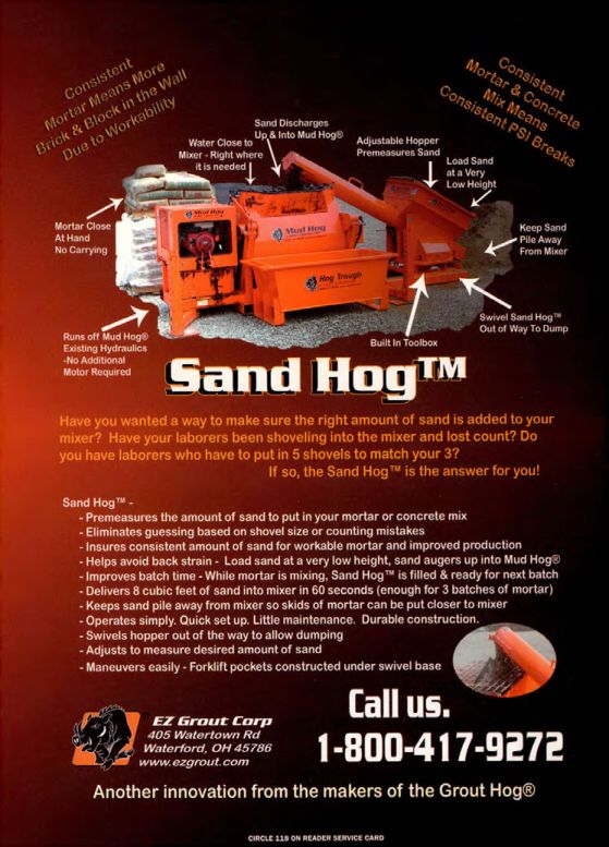 Sand Hog™ - Premeasures the amount of sand to put in your mortar or concrete mix. Eliminates guessing based on shovel size or counting mistakes. Insures consistent amount of sand for workable mortar and improved production. Helps avoid back strain - Load sand at a very low height, sand augers up into Mud Hog®. Improves batch time - While mortar is mixing, Sand Hog™ is filled & ready for next batch. Delivers 8 cubic feet of sand into mixer in 60 seconds (enough for 3 batches of mortar). Keeps sand pile away from mixer so skids of mortar can be put closer to mixer. Operates simply. Quick set up. Little maintenance. Durable construction. Swivels hopper out of the way to allow dumping. Adjusts to measure desired amount of sand. Maneuvers easily - Forklift pockets constructed under swivel base.
