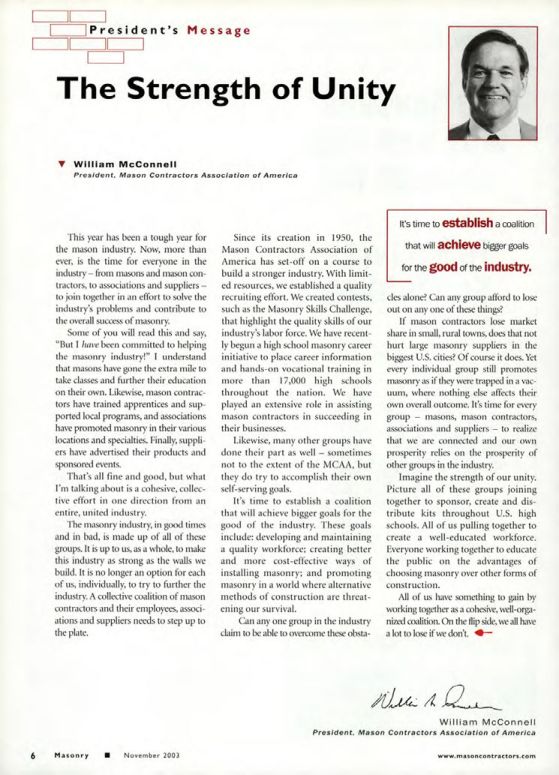 The masonry industry, in good times and in bad, is made up of all of these groups. It is up to us, as a whole, to make this industry as strong as the walls we build. It is no longer an option for each of us, individually, to try to further the industry. A collective coalition of mason contractors and their employees, associations and suppliers needs to step up to the plate.
