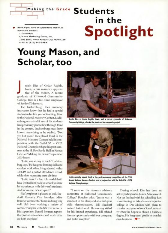 Justin Ries of Cedar Rapids, Iowa, is our masonry apprentice of the month. A recent graduate of Kirkwood Community College, Ries is a full-time employee of Seedorff Masonry.