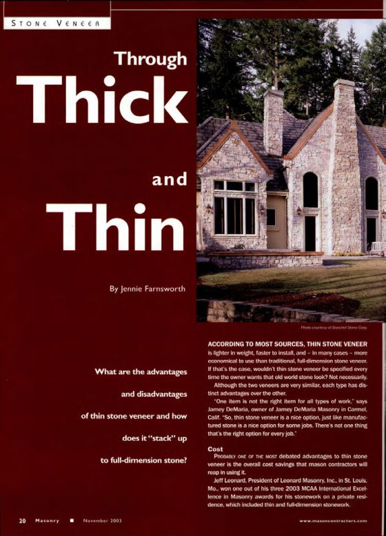 Jeff Leonard, President of Leonard Masonry, Inc., in St. Louis, Mo., won one out of his three 2003 MCAA International Excellence in Masonry awards for his stonework on a private residence, which included thin and full-dimension stonework.