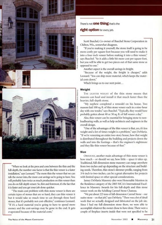 Jamey DeMaria Masonry also won Honorable Mention in the Residence category of the 2003 MCAA International Excellence in Masonry Awards for his full-depth and thin stone veneer work on the Schilling Carmel Stone Chateau.
