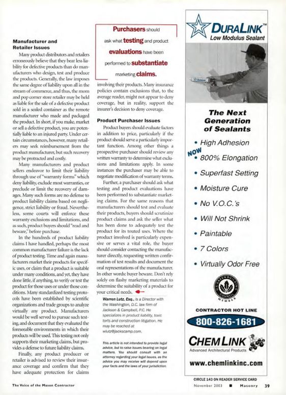 Warren Lutz, Esq., is a Director with the Washington, D.C. law firm of Jackson & Campbell, P.C. He specializes in product liability, toxic torts and construction litigation, He may be reached at wlutz@jackscamp.com.