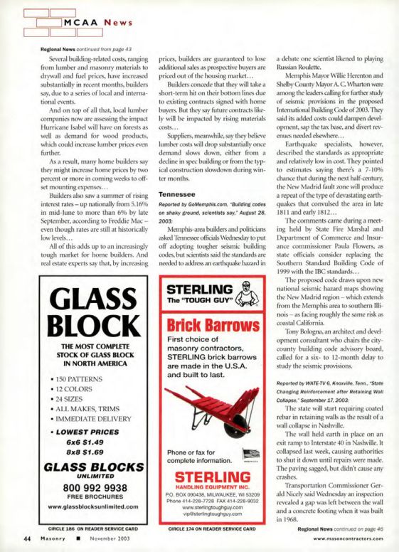 Reported by GoMemphis.com. "Building codes on shaky ground, scientists say," August 28. 2003: