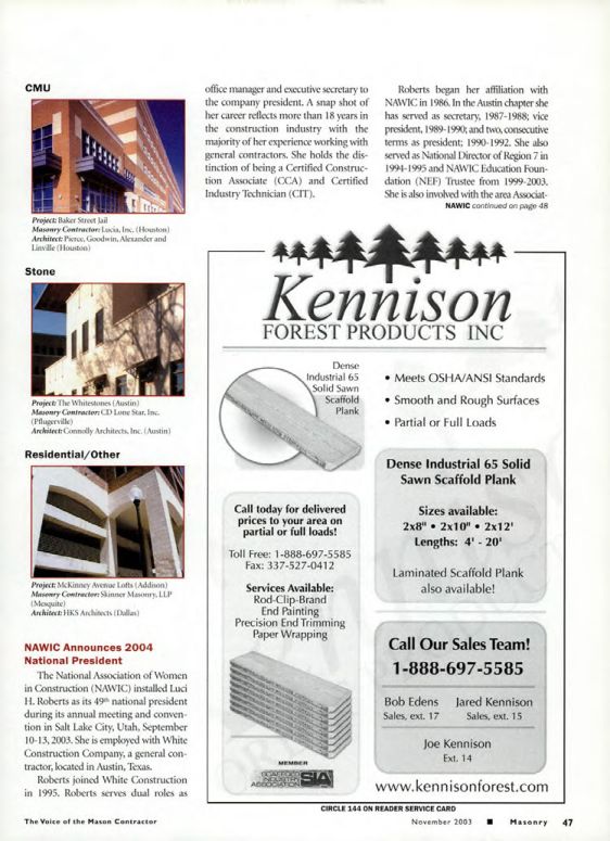 The National Association of Women in Construction (NAWIC) installed Luci H. Roberts as its 49th national president during its annual meeting and convention in Salt Lake City, Utah, September 10-13, 2003. She is employed with White Construction Company, a general contractor, located in Austin, Texas.