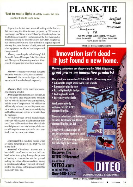 At press time for this issue, we are still waiting on the final verdict concerning the silica standard proposed by OSHA several months ago (see "Government Affairs," pg. 8). Although no one doubts the need to protect workers against the dust byproduct of drilling and sawing, the absurd measures that OSHA has planned puts mason contractors and other industries in jeopardy if passed. Not only that, manufacturers of drills, saws and other equipment are affected by these potential changes as well.