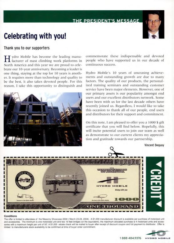 Hydro Mobile has become the leading manufacturer of mast climbing work platforms in North America and this year we are proud to celebrate our 10-year anniversary. Becoming a leader is one thing, staying at the top for 10 years is another. It requires more than technology and quality to be the best, it also takes devoted people. For this reason, I take this opportunity to distinguish and commemorate these indispensable and devoted people who have supported us in our decade of continuous success.