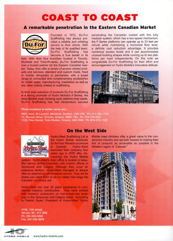 In their wide selection of products Du-For Scaffolding is a strong promoter of Hydro Mobile's F-Series, the most flexible mast climbing work platform ever made. Du-For Scaffolding has had tremendous success penetrating the Canadian market with this fully modular system, which has a two-speed mechanism; the F-Series platforms can operate up to 33 feet per minute while maintaining a horizontal floor level, a definite cost reduction advantage. It provides numerous access levels and it can accommodate unusual building shapes while running up to two platforms per mast independently. On this note we congratulate Du-For Scaffolding for their effort and encouragement on Hydro Mobile's innovative attitude.