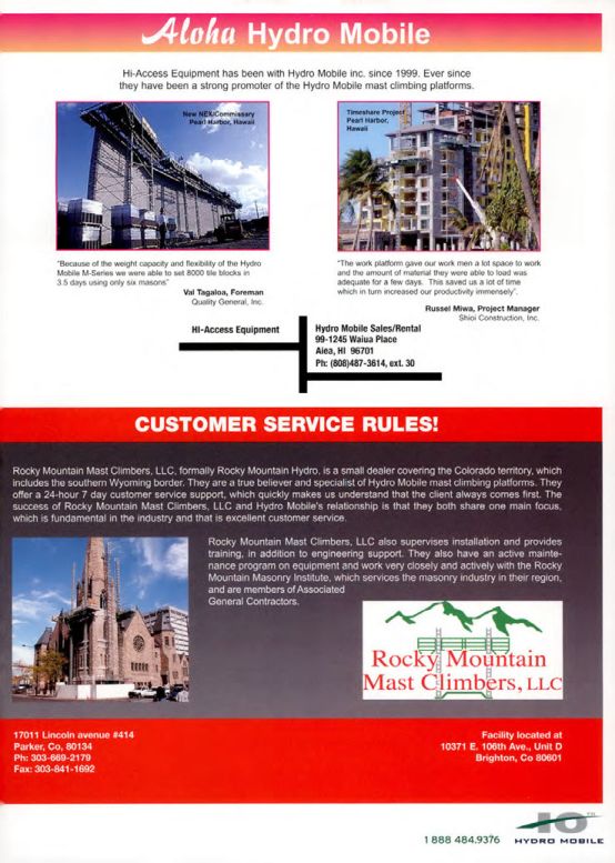 Rocky Mountain Mast Climbers, LLC formally Rocky Mountain Hydro, is a small dealer covering the Colorado territory, which includes the southern Wyoming border. They are a true believer and specialist of Hydro Mobile mast climbing platforms. They offer a 24-hour 7 day customer service support, which quickly makes us understand that the client always comes first. The success of Rocky Mountain Mast Climbers, LLC and Hydro Mobile's relationship is that they both share one main focus, which is fundamental in the industry and that is excellent customer service.