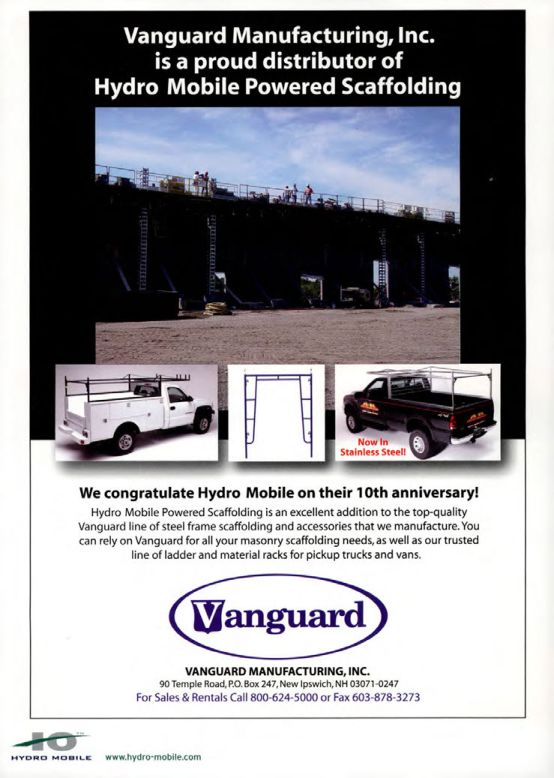 Vanguard Manufacturing, Inc. is a proud distributor of Hydro Mobile Powered Scaffolding. Now in Stainless Steel! We congratulate Hydro Mobile on their 10th anniversary!