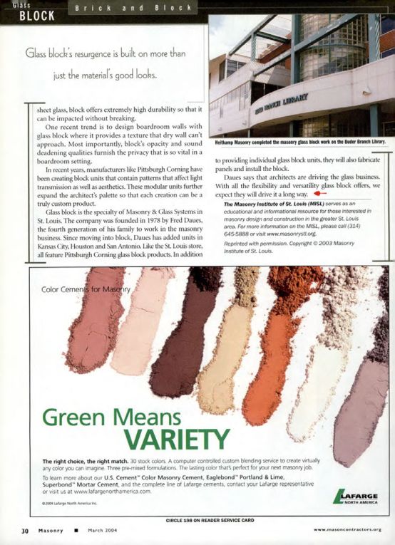 Glass block is the specialty of Masonry & Glass Systems in St. Louis. The company was founded in 1978 by Fred Daues, the fourth generation of his family to work in the masonry business. Since moving into block, Daues has added units in Kansas City, Houston and San Antonio. Like the St. Louis store, all feature Pittsburgh Corning glass block products. In addition Heitkamp Masonry completed the masonry glass block work on the Buder Branch Library.